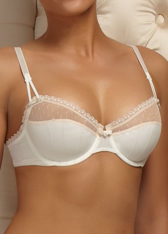 Unlined full busted bra. Stretch georgette multi section cup and wings Rigid Swiss dot trimmed in lace top cup. Spaghetti Strap detail. Double ply clean finish wings for extra support. Care Instructions: Hand Wash Cold Separately. Do Not Bleach. Do Not Twist or Wring. Reshape. Lay Flat to Dry. Do Not Iron. Do Not Dry Clean. View Back.