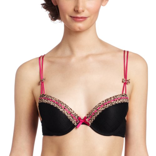 Diamond mesh cups are trimmed with beaded cheetah lace and contrasted with stretch mock ribbonFront contrasted spaghetti straps are detailed with printed bowsAll sizes have 3 hooksSimilar jezebel-women-s-tease-demi-contour-seamless-bra-black-36b